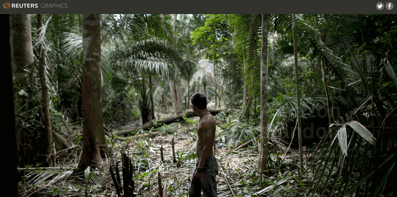 Story produced at Reuters about the increase in the number of invasions and attacks on indigenous reservations and deforestation alerts in the Amazon rainforest during Brazil's President Jair Bolsonaro’s presidential campaign in 2018. Tools used: QGIS, Python (pandas), Illustrator, HTML, CSS, JavaScript, Photoshop.