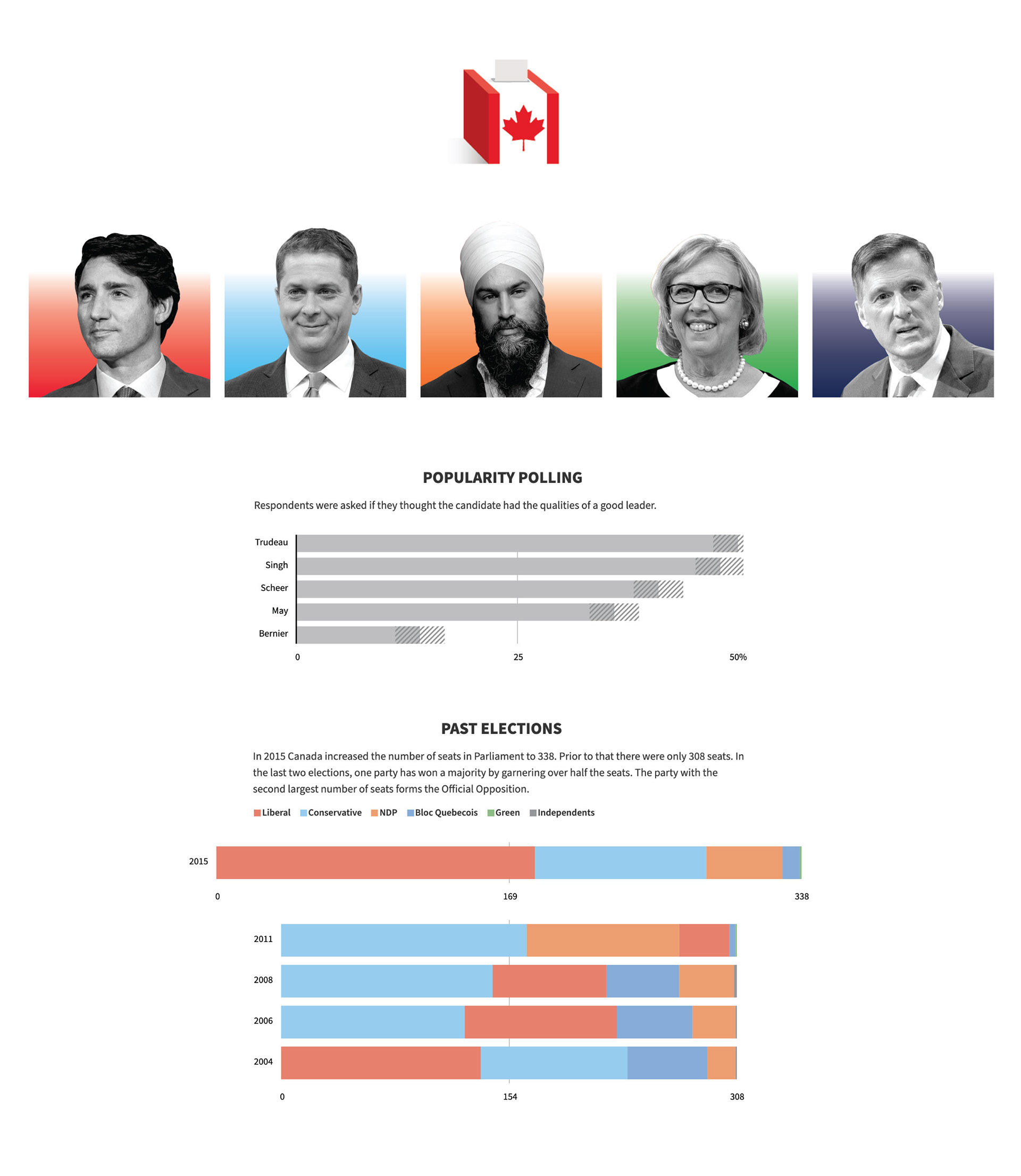 Pre-election pieces that discuss the main candidates for Argentina's and Canada's presidential race in 2019. Tools used: HTML, CSS, JavaScript, d3.js, Illustrator, Photoshop.