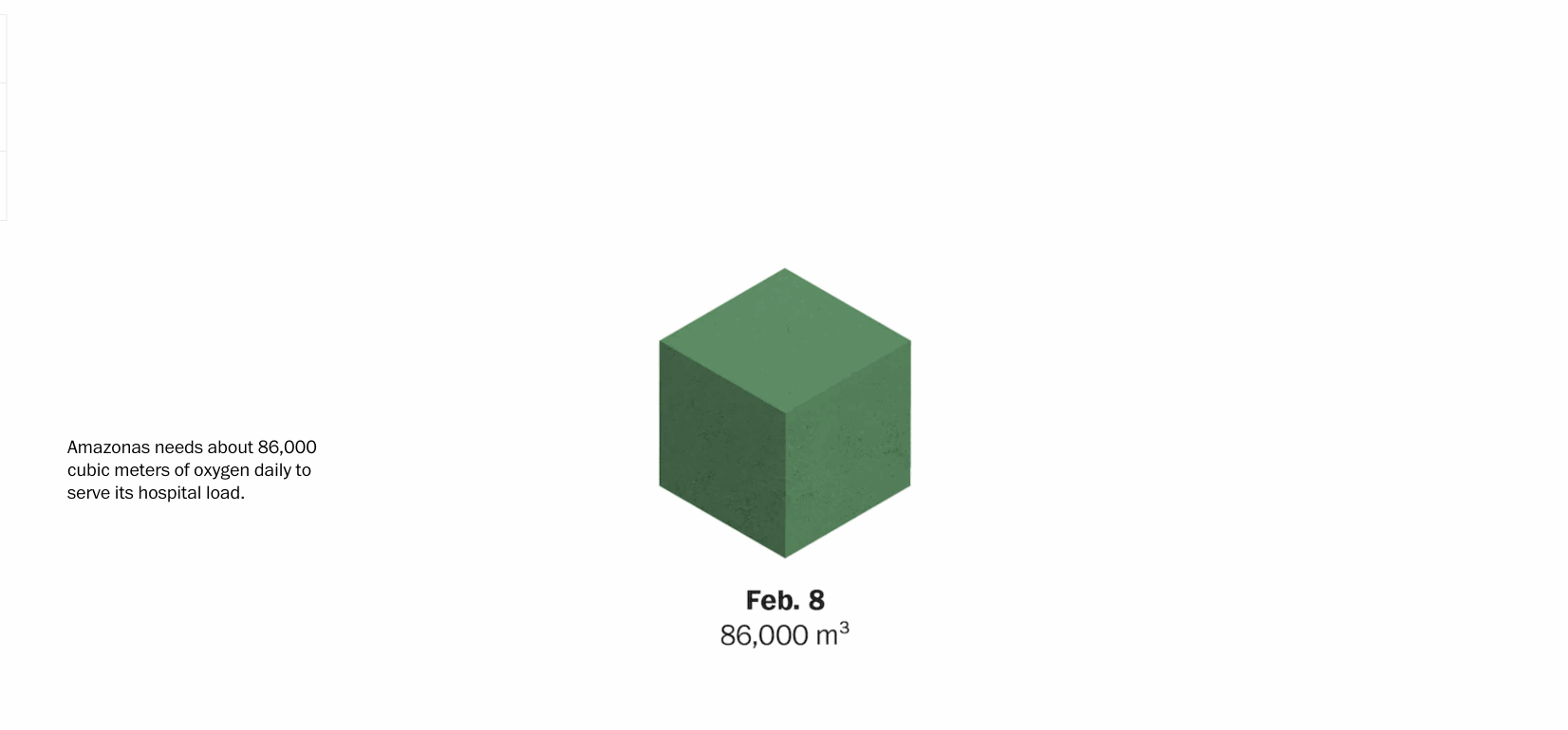 After a new coronavirus variant crushed an Amazonian city, hospitals got full and oxygen consumption skyrocketed, creating a logistical nightmare for local authorities. In my first solo-byline piece at The Post I visualized and reported on the oxygen shortage in remote Brazil during that coronavirus wave. The graphics show the gap between demand and supply and the arduous path for oxygen to reach the sick in one of country's most remote regions. Tools used: Illustrator, QGIS.