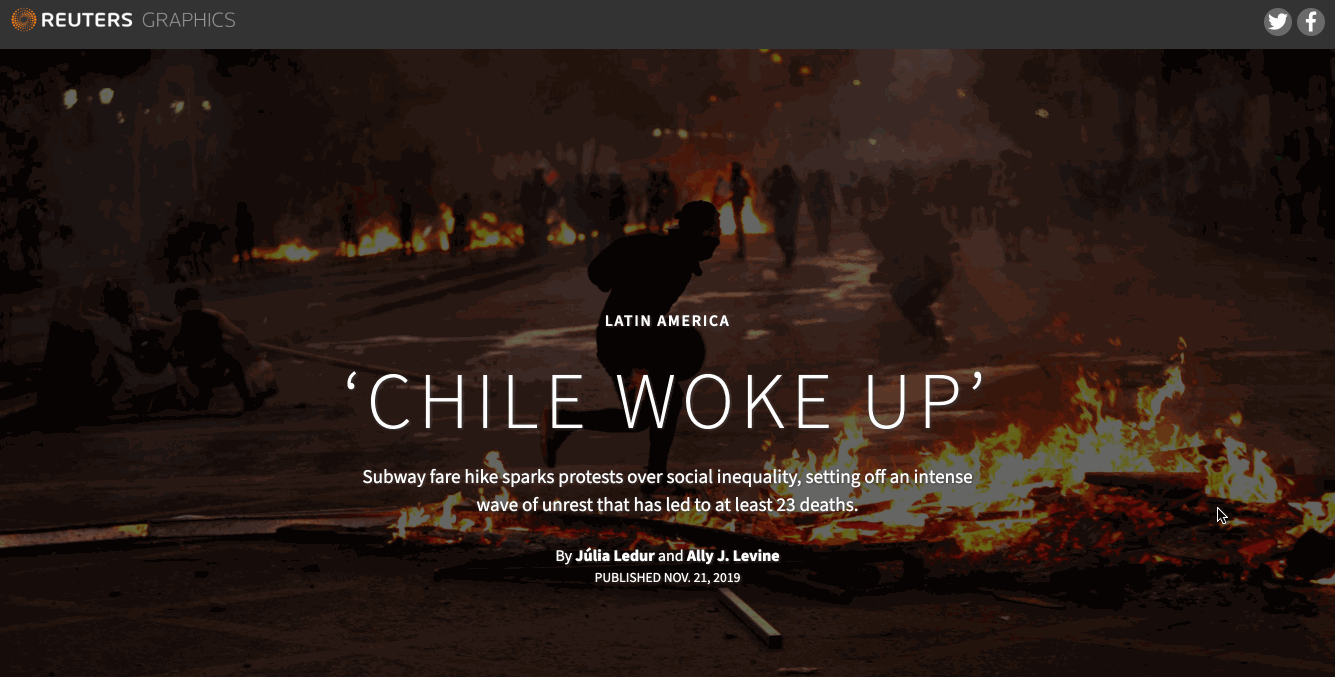 This story explains the historic context behind the protests over social inequality that took place in Chile in October 2019. Photo illustrations are used to show how the Chilean police controlled the crowds as well as the methods used by protestors to defend themselves. Tools used: JavaScript, CSS, HTML, Photoshop, Illustrator.