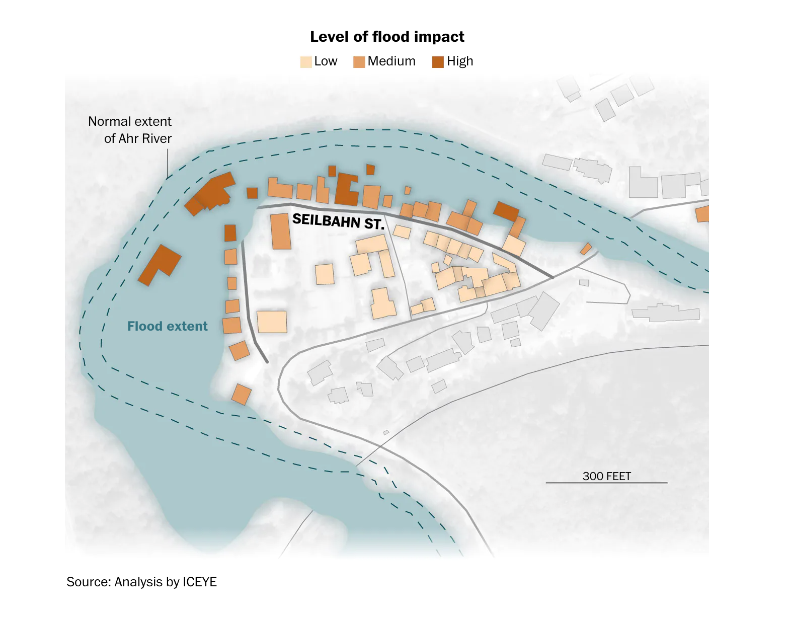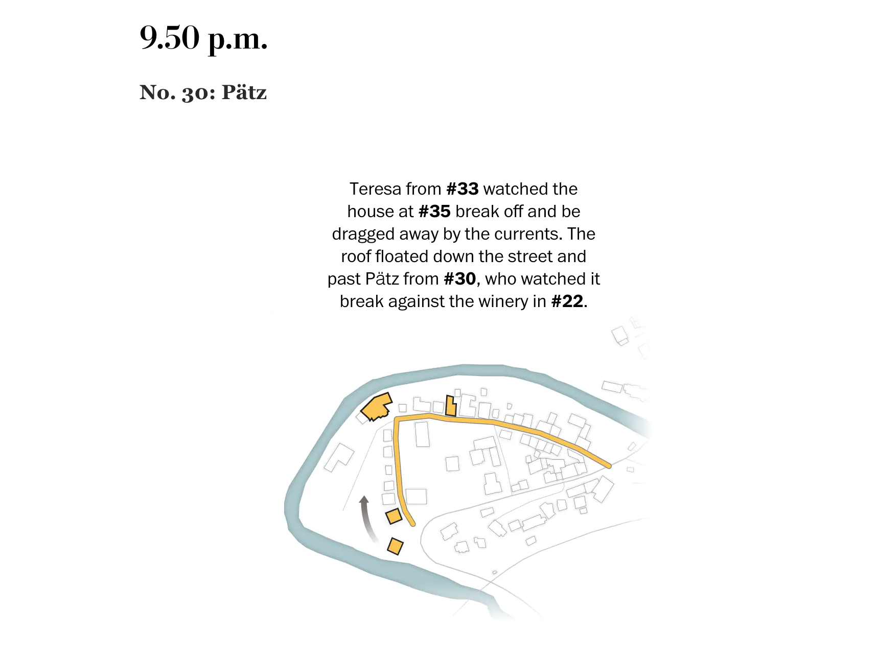 In July 2021, floodwaters wrought destruction across Germany and Belgium. On Seilbahn Street, in Altenahr — a small town in the German mountains — whether one lived or died came down to split-second decisions or simple luck. In this piece we told the story of each resident of the street and visualized the aftermath of the floods. Tools used: OpenStreetMaps, QGIS, Illustrator.