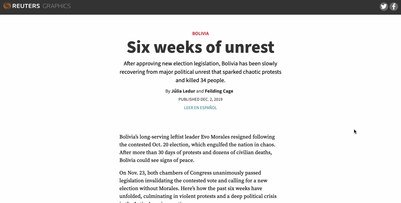 This piece shows how the unrest in Bolivia unfolded in the six weeks after the October 20 contested election. Tools used: JavaScript, CSS, HTML, Illustrator, jQuery, d3.js.